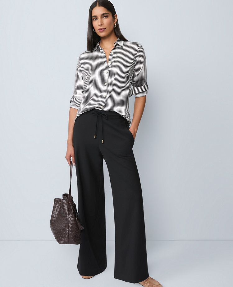 You'll turn to these cozy - chic joggers from morning to night. Elasticized drawstring waistband. Front off - seam pockets. Back welt pockets., Leg Shape: Wide Leg a modern must - have with a statement leg and flattering high waist, Rise: High rise sits 1/2"to 1 below natural waist, Imported:, Fit: Relaxed & easy, Length: Full length 28 1/2"inseam with 22 1/2"leg opening, Fabrication: 68% Polyester, 30% Rayon, 2% Spandex, Garment Care: Machine Washable Petite Wide - Leg Jogger Pant by Ann Taylor Size Petite - Large Black Women's Regular, Wide Leg Pants 68% Polyester 30% Rayon 2% Spandex Machine Washable