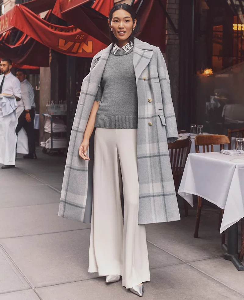 Top off your cool weather wardrobe with this timeless peacoat, done in polished plaid. Notched collar Long sleeves with functional sleeve buttons for added styling options. Double breasted button front. Vertical welt pockets. Front flap welt pockets. Back vent Lined, Hit: 46"long, Imported:, Fit: Straight fit, Length: Hits below knee, Fabrication: Shell 51% Polyester, 32% Wool, 7% Acrylic, 5% Rayon, 5% Other Fibers; Lining: 100% Polyester, Garment Care: Dry Clean Only Plaid Peacoat by Ann Taylor Size Classic - Small Magnesium Women's Outerwear, Long Sleeve Jackets Shell 51%, Polyester 32% Wool 7% Acrylic 5% Rayon 5% Other Fibers Lining 100%, Polyester Dry Clean Only