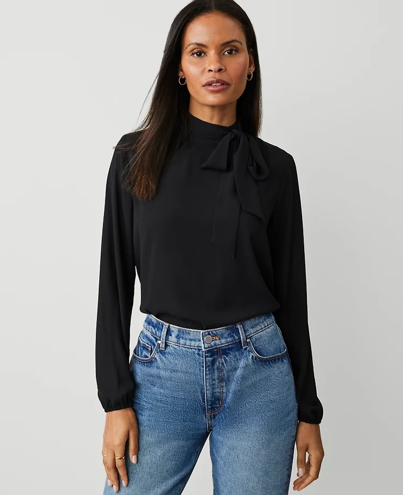 Look effortlessly put together in this sophisticated bow - neck top, fitted with feminine blouson sleeves. Standing collar with ties. Long sleeves with elasticized cuffs. Back button keyhole., Imported:, Fit: Blousy our most relaxed fit, Length: 23 1/2 long, Fabrication: 100% Polyester, Garment Care: Machine Washable Popover Bow Blouse by Ann Taylor Size Classic - XS Black Women's Mock, Neck Long Sleeve Blouse Tops 100% Polyester Machine Washable