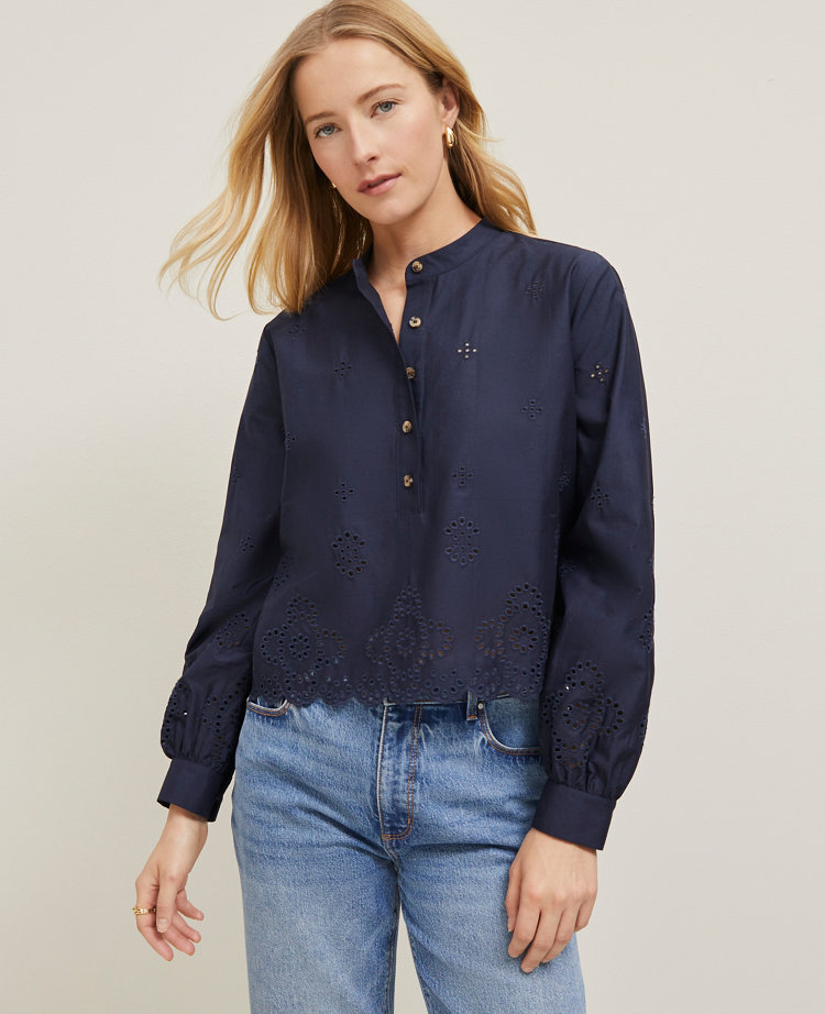 With a waist - grazing embroidered hem and scalloped edges, this blouse is a fresh take on a feminine staple. Tab collar Front Henley button placket. Long blouson sleeves with button cuffs., Imported:, Fit: Blousy our most relaxed fit, Length: 20 1/2 long, Fabrication: 100% Cotton, Garment Care: Machine Washable Scalloped Cutout Blouse by Ann Taylor Size Classic - 2XS Night Sky Women's 100%, Cotton Split Neck Long Sleeve Popover Tops 100% Cotton Machine Washable