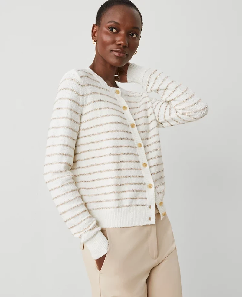 Meet your instant wardrobe icon, the Ann Cardigan. Tailored in a soft knit, our signature favorite comes in an array of rich colors and patterns. Ribbed round neck, cuffs and hem. Front button closures. Long sleeves, Imported:, Fit: Softly fitted, Length: 21 1/2 long, Fabrication: 64% Cotton, 23% Nylon, 13% Polyester, Garment Care: Machine Washable Sequin Striped Ann Cardigan by Taylor Size Classic - Small Camel / White Combo Women's Crew, Neck Long Sleeve Cardigan Sweaters 64% Cotton 23% Nylon 13% Polyester Machine Washable