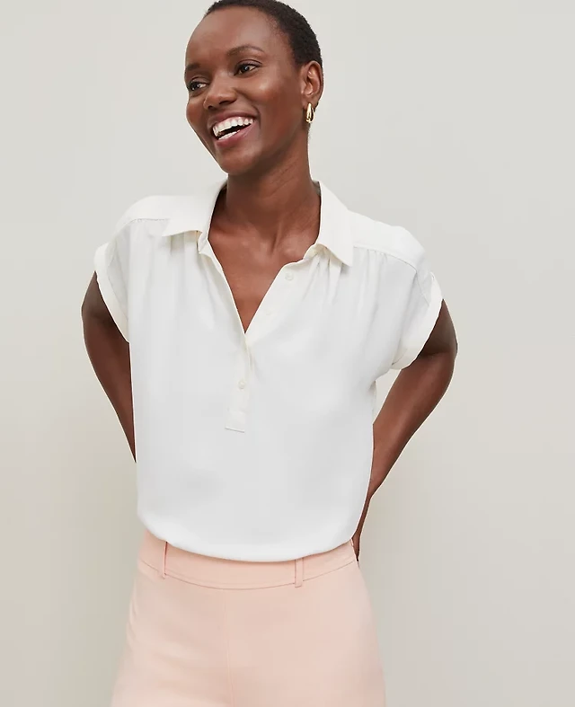 Ann Taylor Split Neck Popover Top Size Medium Winter White Women's