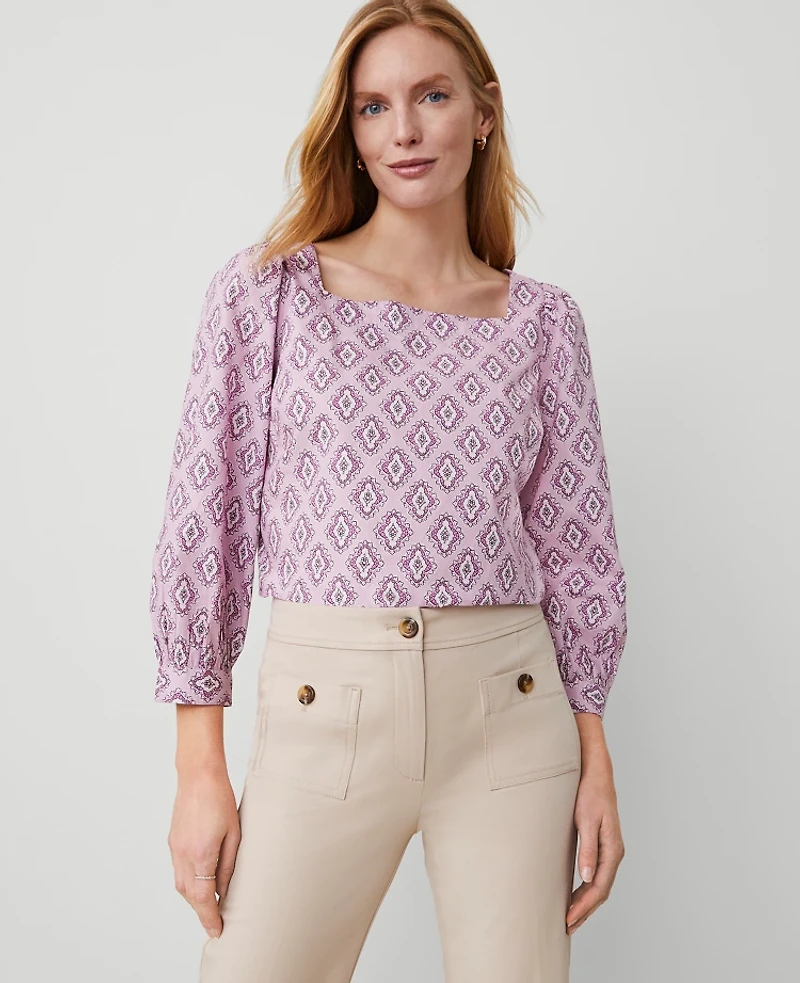 From its a clean square neck to its romantic puff sleeves, this foulard blouse is a versatile and sophisticated style staple. Square neck 3/4 sleeves with button cuffs., Imported:, Fit: Classic an easy, straight fit Length: 22 1/2 long, Fabrication: 100% Cotton, Garment Care: Machine Washable Square Neck Puff Sleeve Blouse by Ann Taylor Size Classic - XL Orchid Breeze Women's 100%, Cotton Square Neck Short Sleeve Shirts Tops 100% Cotton Machine Washable