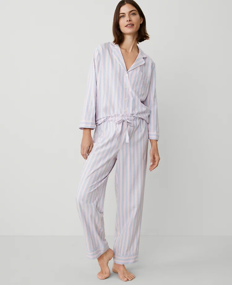 Style is effortless around the clock with comfortable, flattering essentials like this striped pajama set. Top: notched lapels. Front - button closures. Long sleeves Chest pocket Shirttail hem Pants: elasticized drawstring waist., Imported:, Length: 28 1/2 inseam, Fabrication: 55% Cotton, 45% Viscose, Garment Care: Machine Washable Striped Pajama Set by Ann Taylor Size Classic - XS Whimsical Pink Women's Other, Fashion Accessories 55% Cotton 45% Viscose Machine Washable