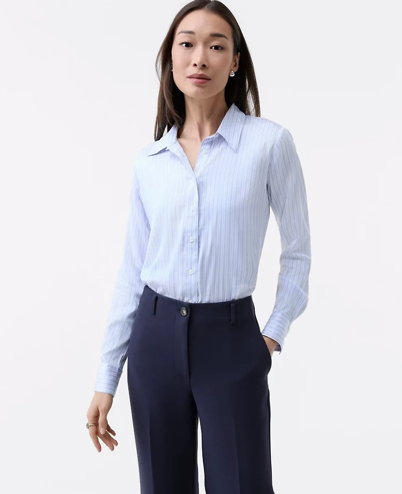We love the classic appeal of a crisp button - down, especially in a relaxed silhouette. Point collar Long sleeves with button cuffs. Button front Back yoke with box pleat. Shirttail hem, Imported:, Fit: Classic an easy, straight fit Length: 27 3/4"front length; 27"back length, Fabrication: 75% Modal, 22% Nylon, 3% Spandex, Garment Care: Machine Washable Striped Relaxed Perfect Shirt by Ann Taylor Size Classic - XS Powdered Periwinkle Women's Split, Neck Long Sleeve Button Down Tops 75% Modal 22% Nylon 3% Spandex Machine Washable