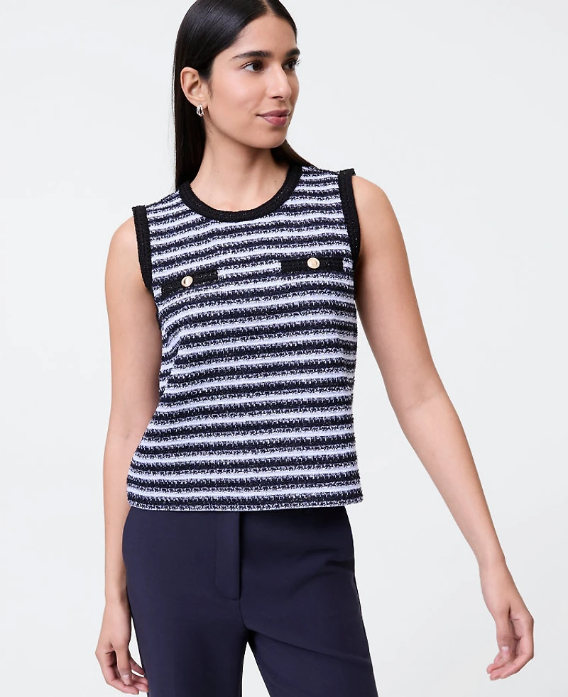 Designed with a flattering crew neckline and polished chest pockets, this top effortlessly elevates any look. Crew neck Sleeveless Back button keyhole. Front button welt pockets. Lined body, Imported:, Length: 22"long, Fabrication: 98% Polyester, 2% Spandex, Garment Care: Machine Washable Striped Tweed Trim Top by Ann Taylor Size Classic - 2XS Navy / White Women's Crew, Neck Sleeveless Tanks Shells Tops 98% Polyester 2% Spandex Machine Washable