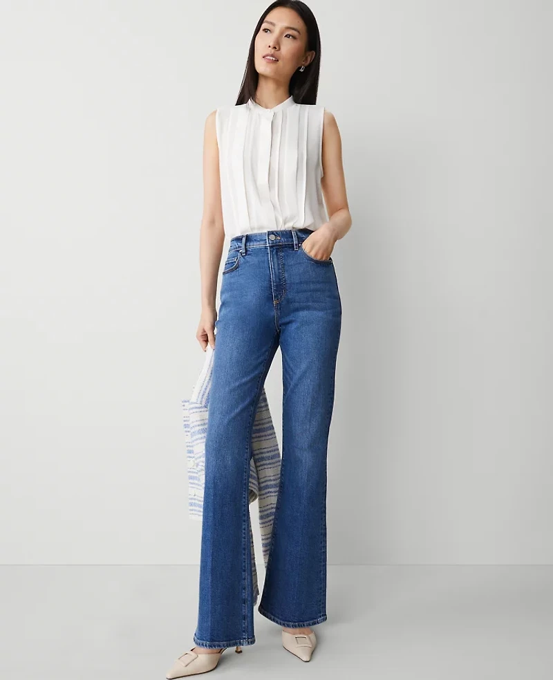 Our high - rise flare jeans are designed with new pockets that smooth, flatter and hold your shape. Performance stretch denim sculpts, shapes and supports all day long. Front zip with a button closure. Belt loops Classic five - pocket styling., Leg Shape: Flare a flattering high rise and lean fit that widens at the knee, Rise: High rise sits 1/2 to 1 below natural waist, Imported:, Fit: Relaxed & easy, Length: Full length 29 1/2 inseam with 20 leg opening, Fabrication: 84% Cotton, 15% Lyocell, 1% Spandex, Garment Care: Machine Washable The Petite Flare Jean by Ann Taylor Size Petite - 6 Luxe Medium Wash Women's Cotton, Blend Regular Flare Pants 84% Cotton 15% Lyocell 1% Spandex Machine Washable