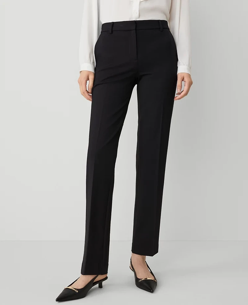 The classic lean fit of this straight - leg pant gives it a chic, structured silhouette. Front zip with hook - and bar closure. Belt loops Front off - seam pockets. Back besom pockets., Leg Shape: Straight a leg - skimming shape with tailored, timeless versatility Rise: Mid rise sits 2 1/4"below natural waist, Imported:, Fit: Tailored & fitted, Length: Full length 28 1/2"inseam with 17"leg opening, Fabrication: 66% Rayon, 30% Nylon, 4% Spandex, Garment Care: Machine Washable The Petite Sophia Pant by Ann Taylor Size Petite - 4 Black Women's Curvy, Straight Pants 66% Rayon 30% Nylon 4% Spandex Machine Washable