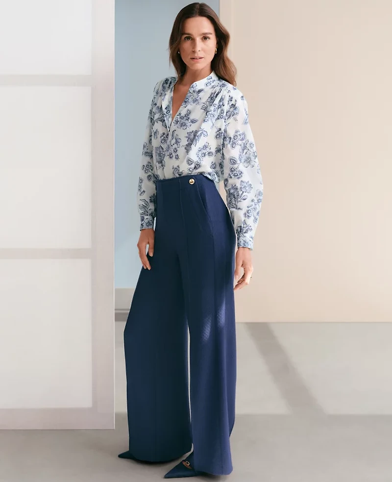 Topped with button detailing for a nautical nod, these wide - leg sailor pants are the perfect balance of modern styling and timeless detail. Side zip Onseam pockets. Back welt pockets., Leg Shape: Wide Leg a modern must - have with a statement leg and flattering high waist, Rise: High rise sits 1/2 to 1 below natural waist, Imported:, Fit: Relaxed & easy, Length: Full length 29 1/2 inseam with 24 leg opening, Fabrication: 70% Polyester, 29% Viscose, 1% Spandex, Garment Care: Machine Washable The Petite Wide - Leg Sailor Pant in Texture by Ann Taylor Size Petite - 2 Royalty Blue Women's Regular, Wide Leg Pants 70% Polyester 29% Viscose 1% Spandex Machine Washable