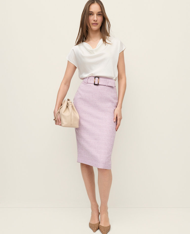 From the streamlined silhouette to the polished belt, you'll wear this timeless skirt for years to come. Hidden back zip with hook - and eye closure. Belt loops with adjustable - buckle belt. Back vent Lined, Bullet1: For heights 5'4"and below, try our petite fit., Hit: Hits below the knee, Imported:, Length: 28"long, Fabrication: 100% Polyester, Garment Care: Machine Washable Tweed Belted Pencil Skirt by Ann Taylor Size Classic - 14 Violet Orchid Women's A - Line, Skirts 100% Polyester Machine Washable