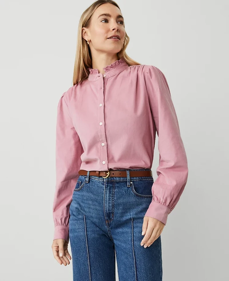 Discover Ann Taylor Weekend. Effortlessly polished looks for wherever your plans take you. Stand ruffle collar. Long sleeves with button cuffs. Button front Shirred shoulder seams and back yoke. Shirttail hem, Imported:, Fit: Classic an easy, straight fit Length: 26"long, Fabrication: 100% Cotton, Garment Care: Machine Washable Weekend Collection Corduroy Ruffle Neck Shirt by Ann Taylor Size Classic - Small Foxglove Women's 100%, Cotton Split Neck Long Sleeve Button Down Tops 100% Cotton Machine Washable