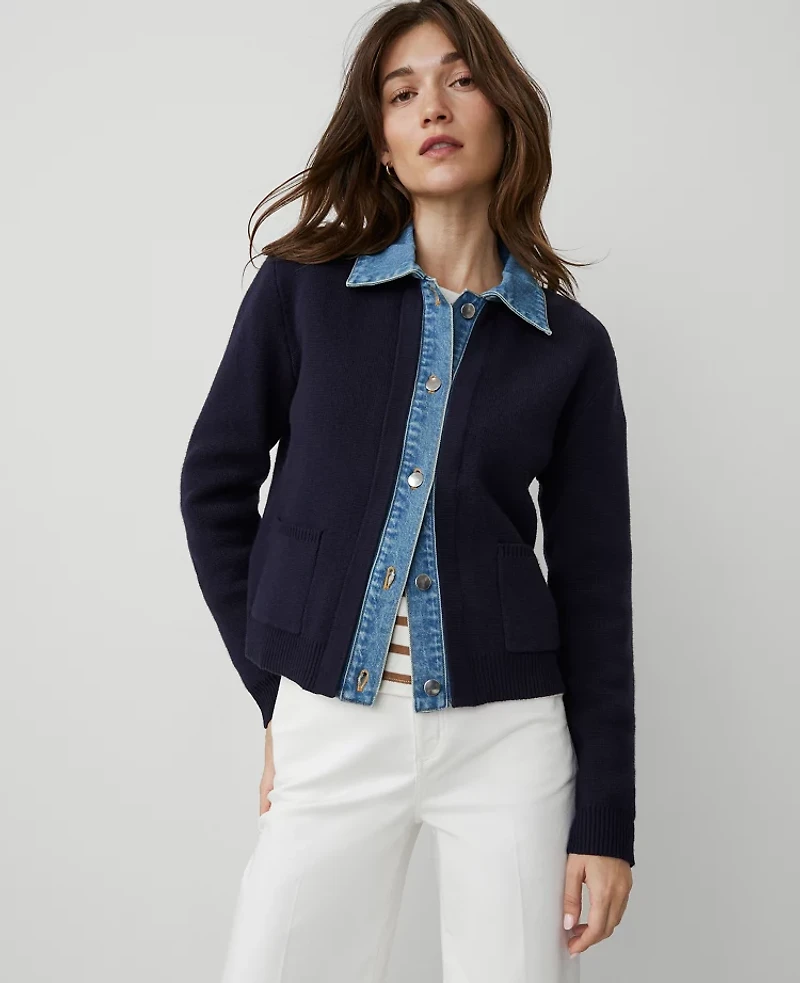 Discover Ann Taylor Weekend. Effortlessly polished pieces for wherever your plans take you. Denim trim gives this soft sweater the effortless cool factor of a layered cardigan and jacket. Point collar Front button closures. Long sleeves, Imported:, Fit: Softly fitted, Length: 21 1/2 long, Fabrication: 55% Cotton, 27% Polyester, 18% Nylon Exclusive of Decoration, Garment Care: Machine Washable Weekend Collection Denim Sweater Jacket by Ann Taylor Size Classic - Small Night Sky Women's Cotton, Blend Crew Neck Long Sleeve Jacket Sweaters 55% Cotton 27% Polyester 18% Nylon Exclusive of Decoration Machine Washable Best Fall Sweaters