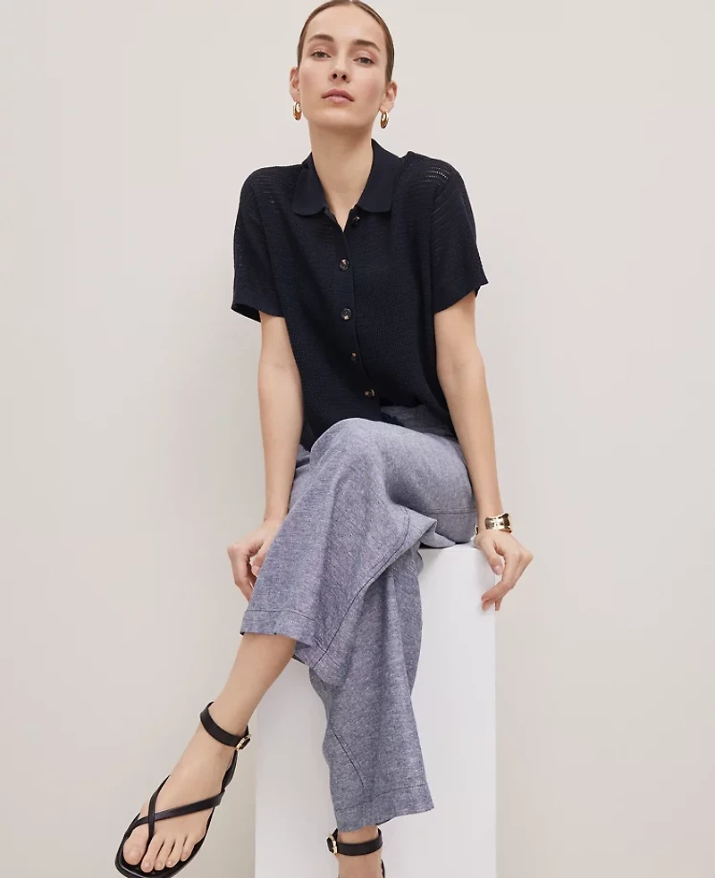 Discover Ann Taylor Weekend. Effortlessly polished pieces for wherever your plans take you. This fresh short sleeve cardigan softens outfits with a relaxed fit and whisper - weight mesh. Point collar Front button closures. Drop shoulders Short sleeves, Imported:, Fit: Softly fitted, Length: 21 1/2 long, Fabrication: 58% Acrylic, 26% Lyocell, 16% Linen, Garment Care: Machine Washable Weekend Collection Mesh Collared Cardigan by Ann Taylor Size Classic - Medium Night Sky Women's V - Neck, Short Sleeve Cardigan Sweaters 58% Acrylic 26% Lyocell 16% Linen Machine Washable