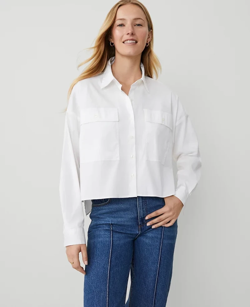 Discover Ann Taylor Weekend. Effortlessly polished, lived - in looks for wherever your plans take you. Tailored and perfectly relaxed, this oversized cropped shirt is the personification of versatile ease. Point collar Button front Dropped shoulders Long sleeves with button cuffs. Front button flap patch pockets. Hi - low hem., Imported:, Fit: Classic an easy, straight fit Length: 23 long, Fabrication: 79% Cotton, 18% Nylon, 3% Spandex, Garment Care: Machine Washable Weekend Collection Oversized Cropped Pocket Shirt by Ann Taylor Size Classic - XL White Women's Cotton, Blend Split Neck Long Sleeve Shirts Tops 79% Cotton 18% Nylon 3% Spandex Machine Washable