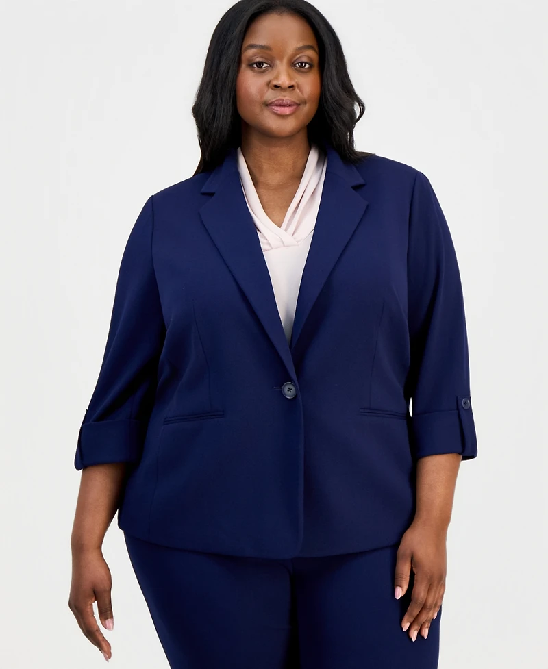 Roll-tab 3/4-sleeves update the classic career-oriented shape of this plus size notched collar one-button jacket from Anne Klein Essentials.