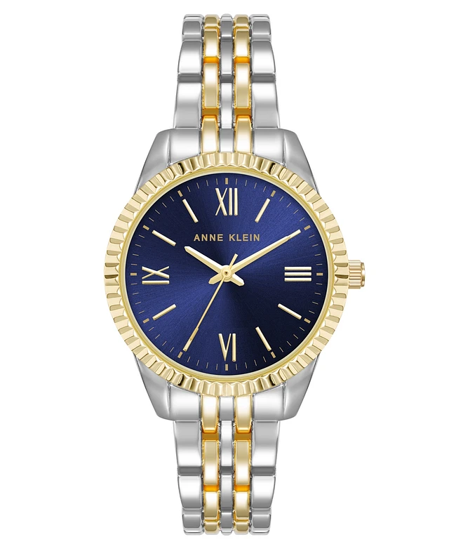 Anne Klein Women's Quartz Coin Edge Two-Tone Metal Alloy and Navy Dial Watch, 30mm