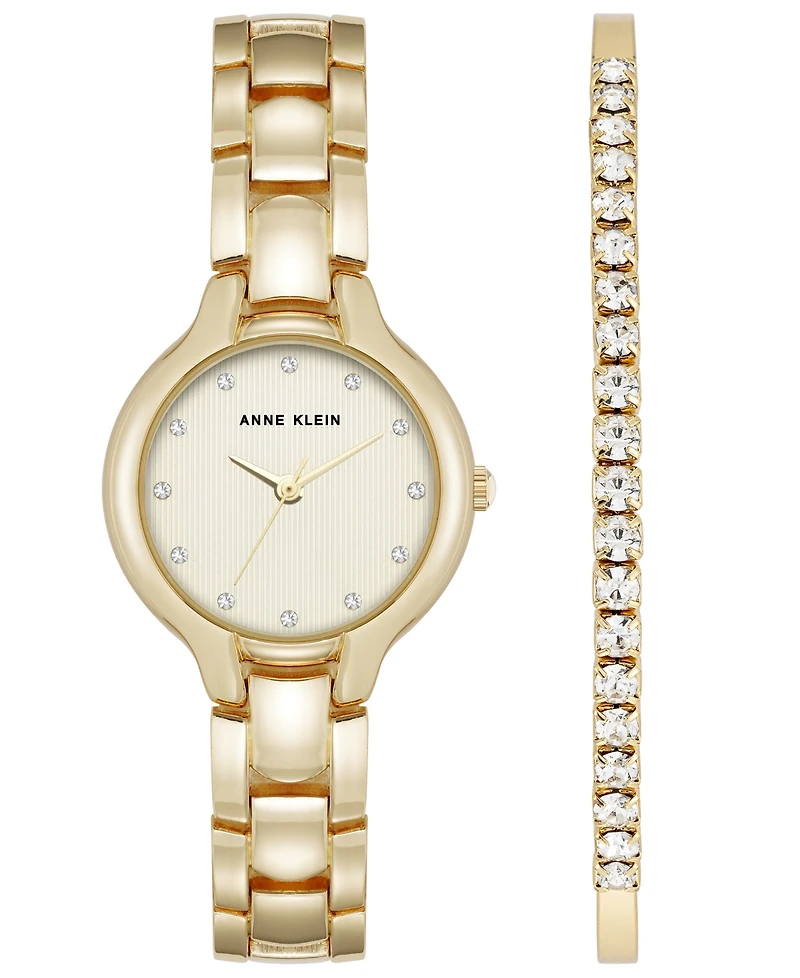 Anne Klein Women's Quartz Crystal Accented Champagne Dial Gold-Tone Alloy Metal Watch Set, 28mm