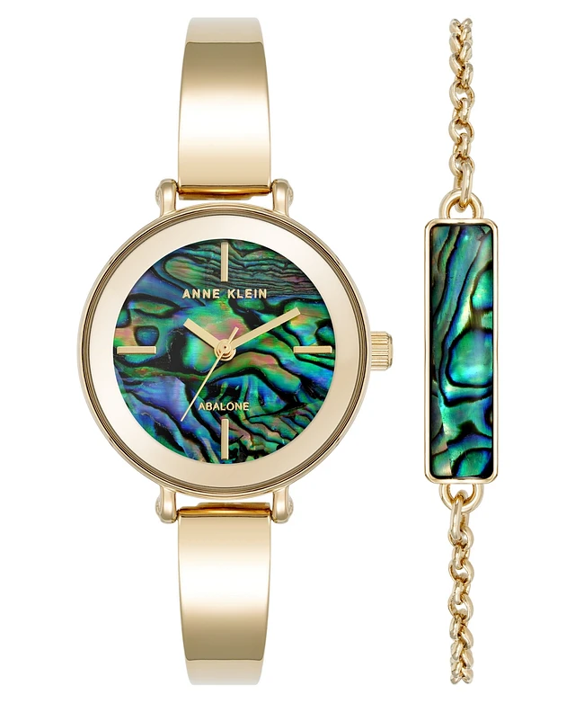 Anne Klein Women's Quartz Round Abalone Gemstone Gold-Tone Alloy Metal Bangle Watch Set, 30mm