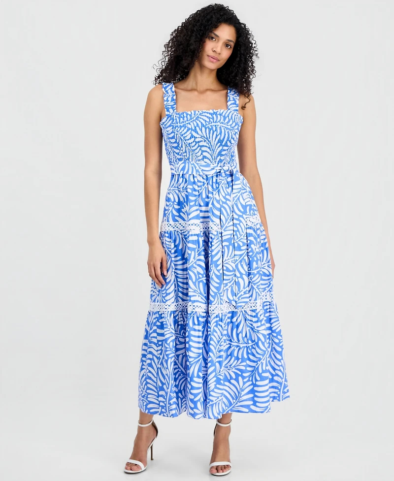 A tropical print brings a vacay-ready vibe to this smocked, midi-length patio dress from Anne Klein.