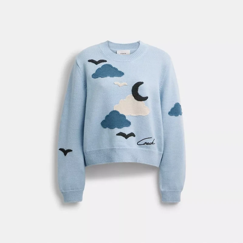 Crafted of a warm wool-blend, this intarsia-knit sweater features hand-crocheted applique depicting a peaceful night sky. Embroidered with our Coach script for a heritage touch, the crewneck is finished with ribbed trim.