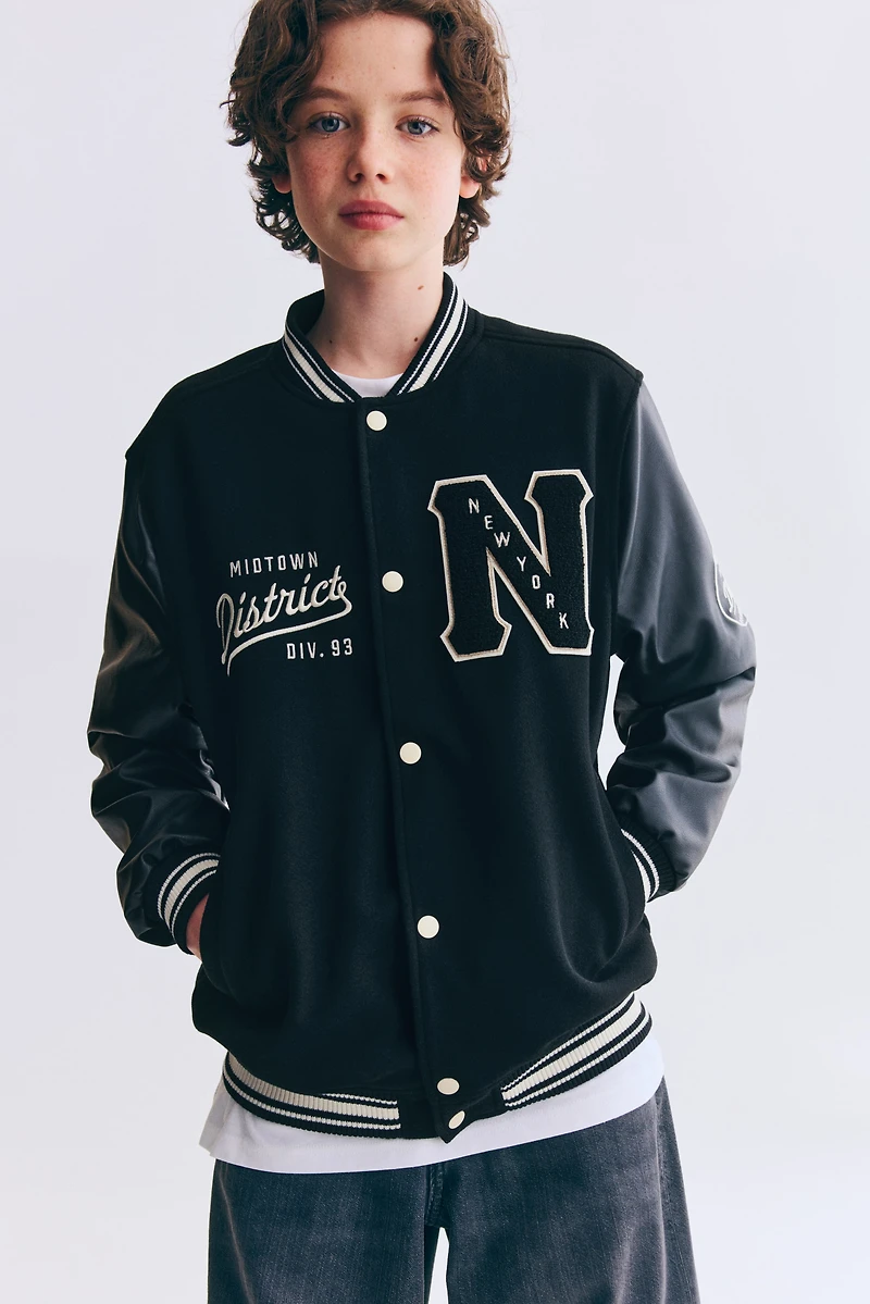 Relaxed-fit baseball jacket in soft, felted fabric with embroidered appliqués and long, padded sleeves in coated fabric. Stand-up collar, snap fasteners at front, and welt side pockets. Gently dropped shoulders and ribbing at collar, cuffs, and hem. Lined.