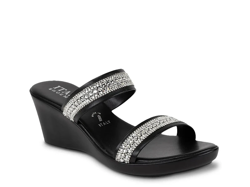Finish off your formalwear with a sparkling touch. The Aracely wedge sandals from Italian Shoemakers feature a classic double strap design, rhinestone embelishments, and a solid heel that lifts your look.