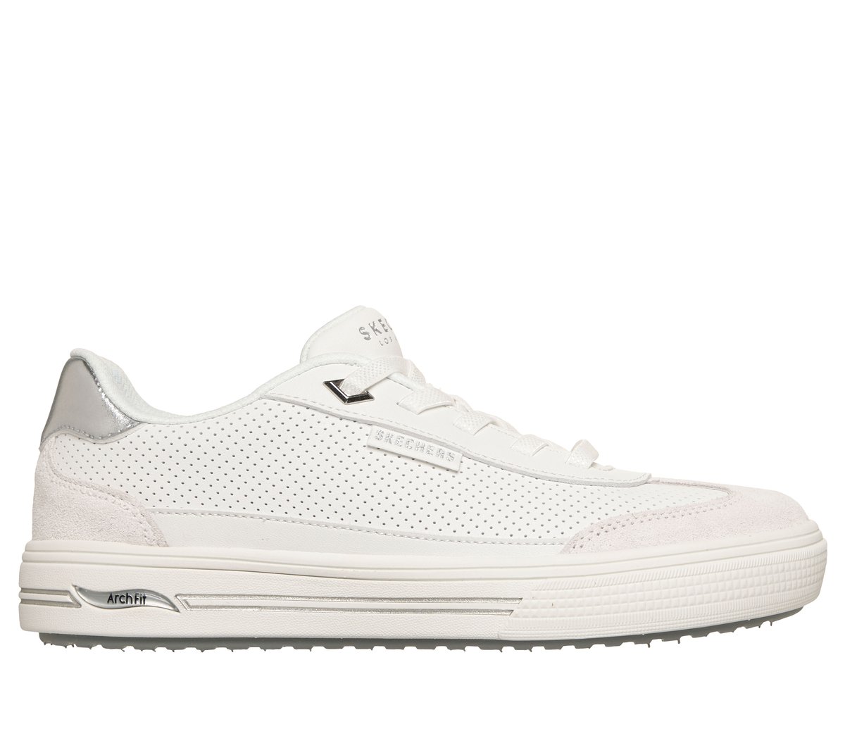 Step out in standout style and cutting-edge comfort with Skechers Street™ Arch Fit® Arcade - Diamond Daze. This easy-on design has been granted the APMA Seal of Acceptance and features a perforated duraleather and genuine suede overlay upper, fixed stretch laces, and a removable Arch Fit® insole for long-lasting support.