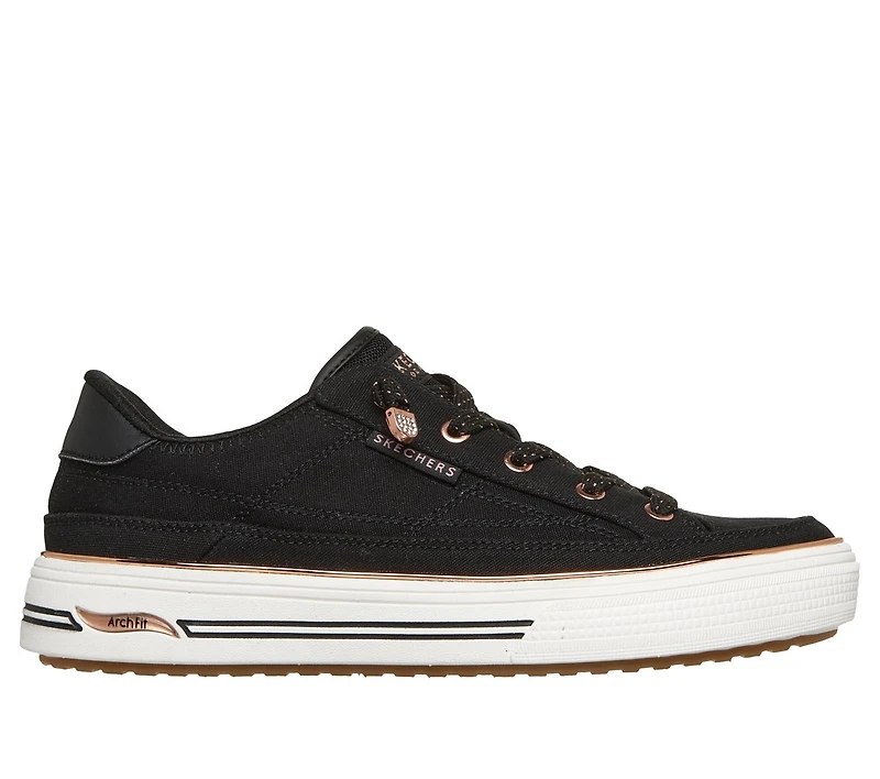 Choose sleek and sparkling style with a classic silhouette and supportive comfort wearing Skechers Street™ Arch Fit® Arcade - Prim N Pretty. This metallic accented design has been granted the APMA Seal of Acceptance and features a canvas upper with decorative tied-off laces, a podiatrist-certified Arch Fit® insole, and a lightweight cushioned midsole.