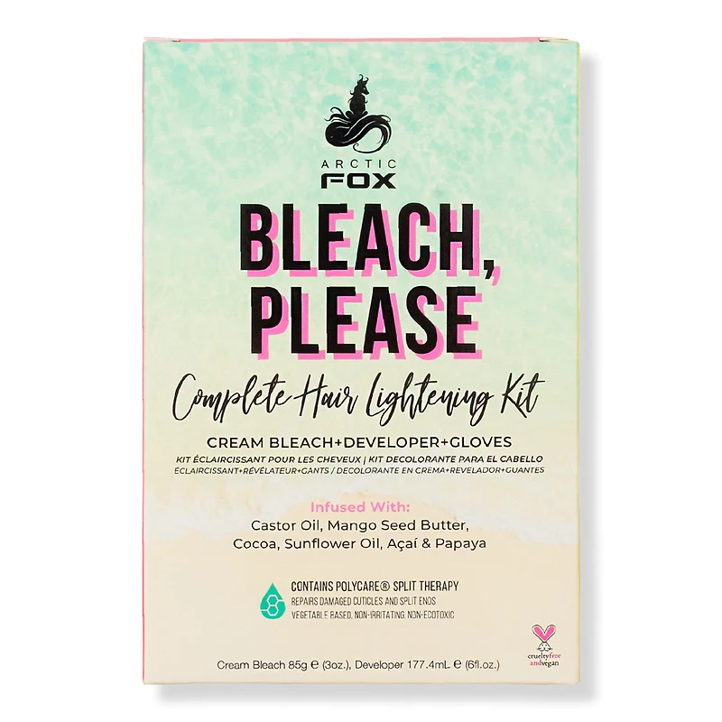 BLEACH PLEASE COMPELTE KIT 9.0OZ. Benefits: Hydrating. Key Ingredients: Polycare Split Therapy - A patented-technology that helps prevent split ends. Castor Oil - Helps accelerate hair growth and to balance scalp pH levels. The antioxidants in castor oil help to support the keratin in hair and to make hair stronger. Papaya Fruit Extract - Helps prevent dandruff and improves circulation to the hair follicles. Acai - Rich in Omegas 3, 6 and 9 and vitamins B, C, and E. Effective for reducing hair loss. Cocoa Seed Butter - Helps to strengthen and moisturize the hair. Sunflower Seed Oil - Helps to boost hair hydration levels. Arginine - Vital in stimulating hair growth. Features: Violet base to help counteract some of the yellow tones we all deal with when it comes to lightening hair.. Gloves and 35 volume developer included. Always do a patch and strand test before coloring..