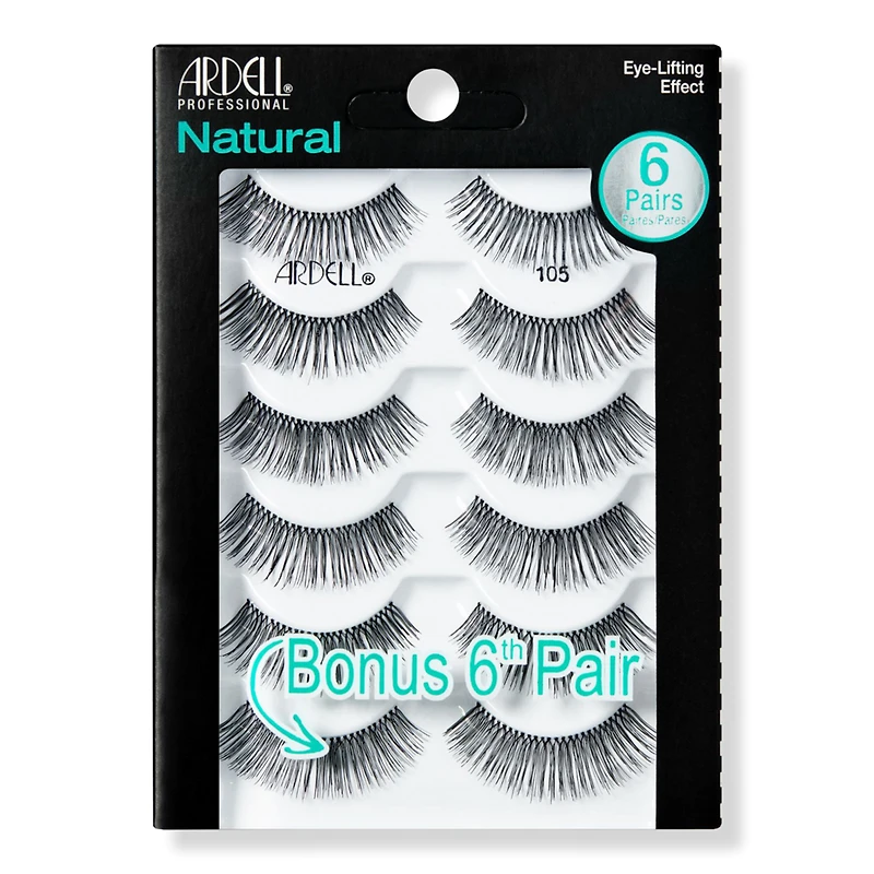 LASH NATURAL #105 5 PAIR MULTIPACK. Features: Feathery volume with just the right length. Natural 105 blends so well with your very own lashes.. Full, fluttery, flourishing lashes. Ardells patented Invisiband lash band technology. Natural lash fibers arranged intricately in a gentle crisscross pattern. Benefits: Feel weightless and fresh all day long. So comfortable, secure and flawless you wont feel youre wearing falsies. Includes: Six pairs of Natural #105 Lashes.