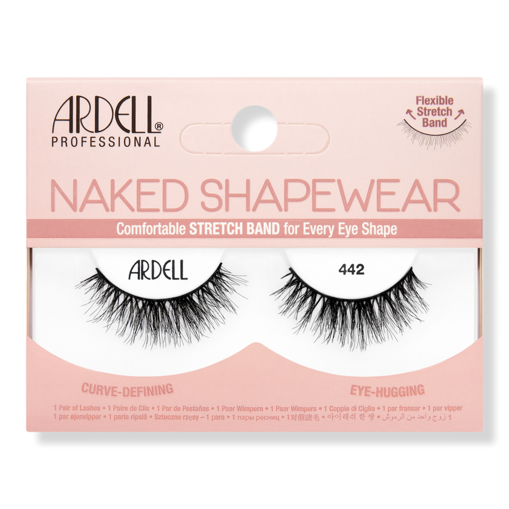 NAKED SHAPEWEAR 442. Benefits: Style 442 is soft, multi-dimensional effects always look natural, never overly dense. Mid-volume, mid-length, rounded. 442: Medium volume, medium length. Helps prevent poking & lifting at the edges. Features: Resilient elastic band retains its stretch, stays in place & wont stretch out. Black band defines the eyes with a liner effect without the need for makeup. V-shape pattern adds airy, voluminous layers to lashes. Inspired by shapewear, powered by StretchTech. :