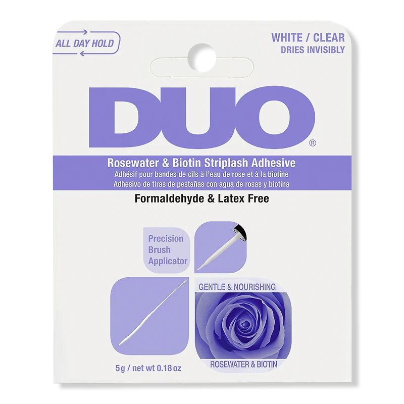 DUO ROSEWATER AND BIOTIN CLEAR. Benefits: Infused with lash boosting Biotin and soothing Rosewater. Features: Duo is the brand of choice for lash users who want a lash adhesive that provides strength, durability and long lasting wear. Non-irritating latex. Clear formula dries invisibly. Ultra-thin brush-on applicator. Precise, mess-free adhesive application. Formulated Without: Formaldehyde.