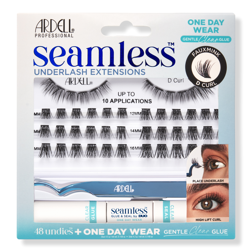 SEAMLESS FAUX MINK D CURL KIT. Features: The high-lift D-curl meets dark, full-bodied volume. Decadent curves ahead: the D-curl is eye-opening, intoxicating and instantly uplifting. The dense and voluminous finish is perfect for nightluxe looks. Faux Mink fibers are luxuriously soft yet lightweight on eyes. Easy-to-use kit includes NEW Seamless Underlash Glue & Seal: clear and gentle 1-day wear plus vitamin care, with strong & secure hold. Benefits: Underlash application conceals the band for a seamlessly undetectable finish. No-show, superfine band. Up to 10 applications. Super-soft, light Undies sit comfortably under real lashes. Customize your look with 48 patented clusters in 4 lengths: 10 mm, 12 mm, 14 mm, 16mm. :