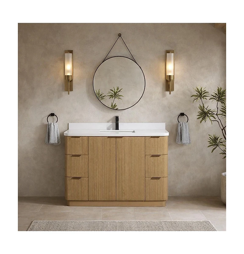 Elevate your bathroom with the Calamigo vanity in washed oak. Featuring a vertically fluted wood design, a crisp white integrated sink, and smooth-glide storage drawers, this vanity blends modern style with warm, natural texture—perfect for a clean, spa-inspired look
