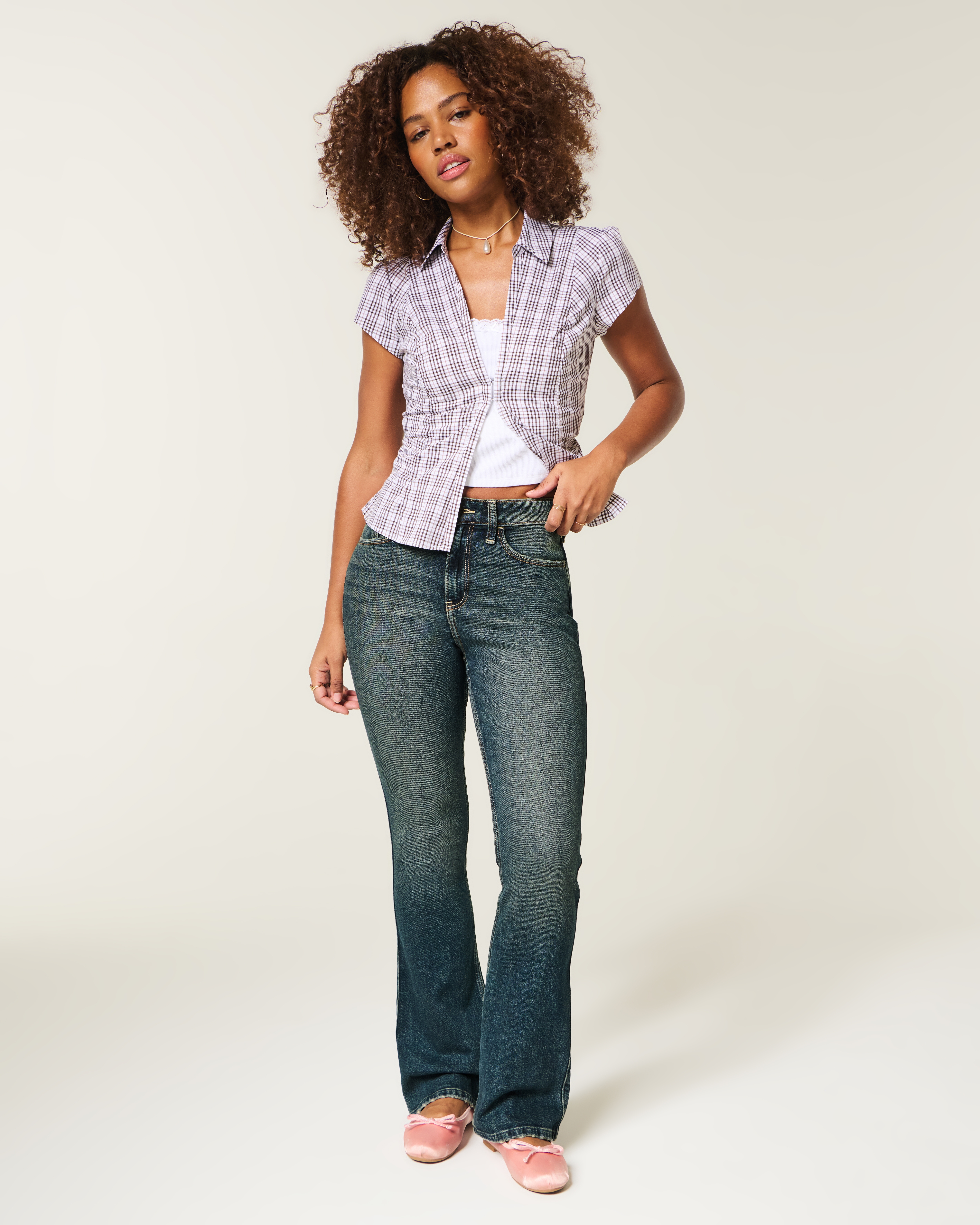 Low-Rise Dark Wash Tab Waist Bootcut Jeans