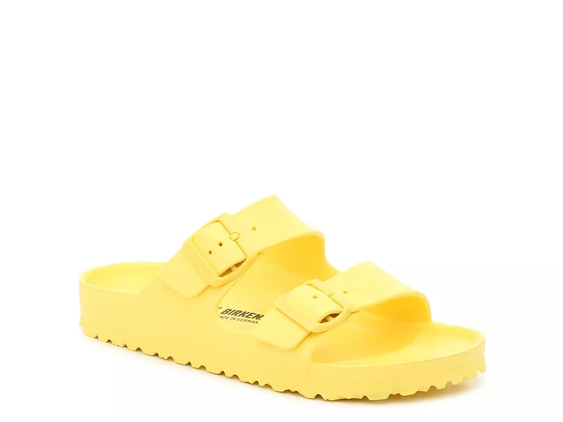 The women's Arizona Essentials sandal is right on trend and fits into your warm weather wardrobe thanks to their casual silhouette. These vibrant slides from Birkenstock feature a flexible EVA material and a waterproof finish for easy care.
