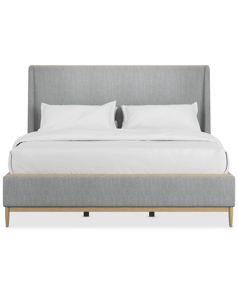 A bed with confident style and effortless comfort. Upholstered in soft gray fabric, it features a sleek maple frame, sculptural lines, and subtly flared wings for a quiet embrace. Tailored yet relaxed-refined, cozy, and never overdone.