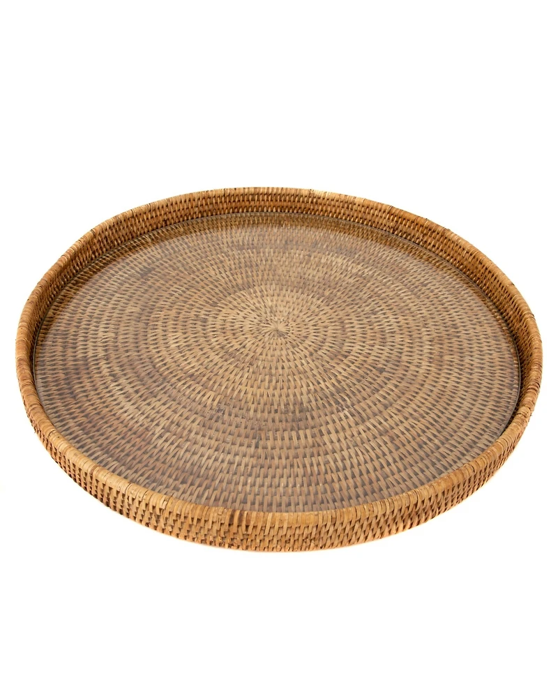 Artifacts Trading Company Rattan Round Serving-Ottoman Tray with Glass Insert