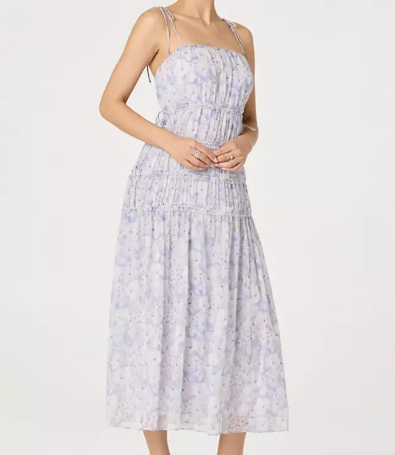 The Keyleth dress is a woven georgette tiered midi dress, featuring adjustable self - tie shoulder straps, elasticized gathered tiers with piped ruffle trim at seams, and decorative self - tie bows. This item can only be exchanged or returned by mail., Imported:, Length: 54"long Loft Astr The Label Keyleth Dress Size XS Lilac Field Women's by Loft Size Regular - XS Lilac Field Women's Shift, Dresses Dressy