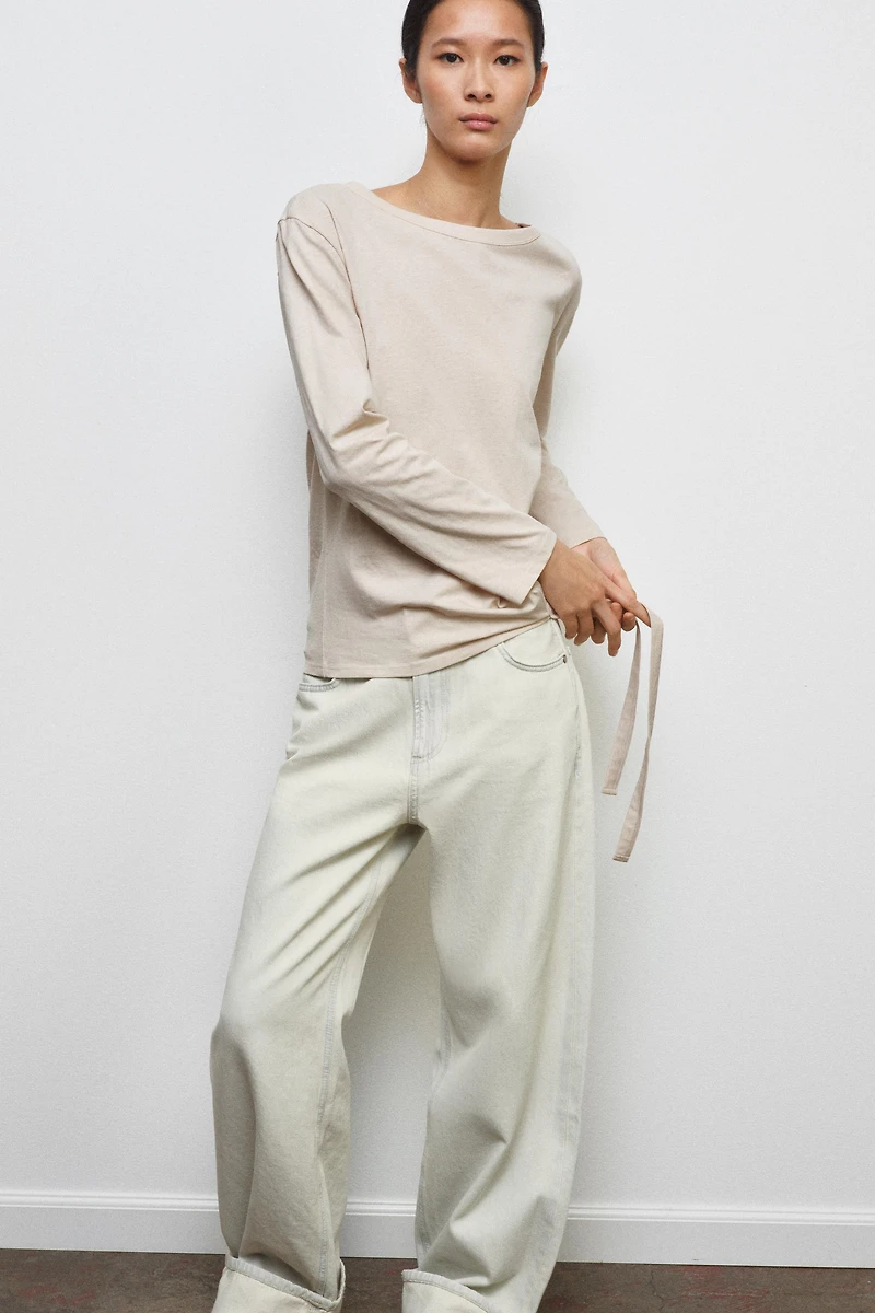 T-shirt with main fabric made of cotton yarn. Round neck and long sleeves. Hem with side slit and ties in the same fabric.