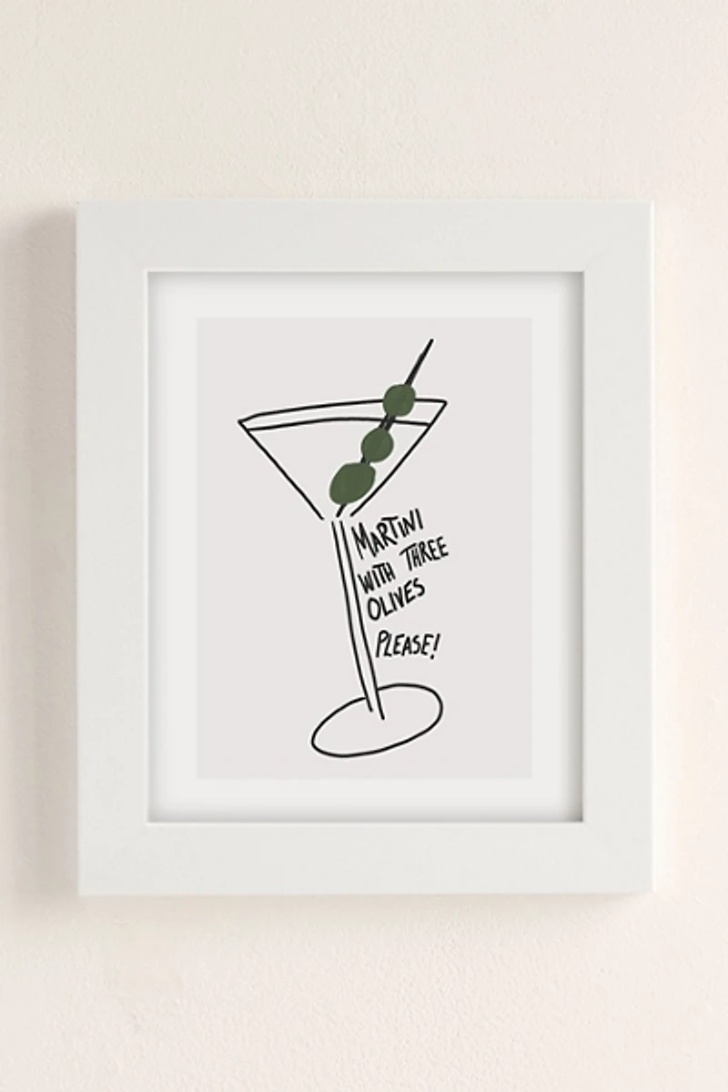 Art print by AthenesAtelier featuring an illustrated martini with three olives. Printed on archival paper made from cotton pressed in Italian mills, this high-quality art print is available in sizes and frames just right for your space. First select your frame (or go frameless), then select your size.