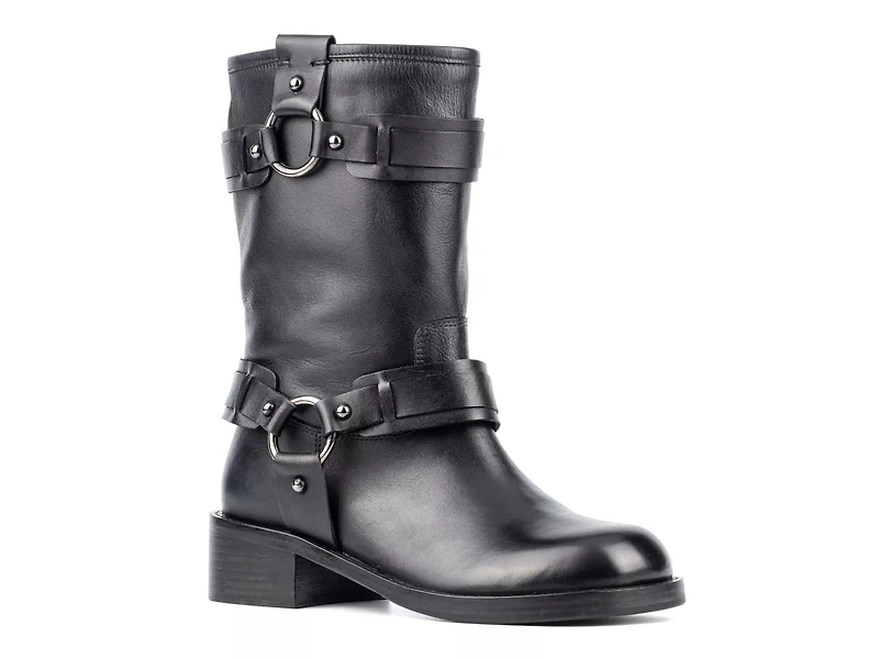 The Vintage Foundry Augusta boot is a sophisticated spin on Western design. The low-heel boot with a washed finish displays non-detachable harness-style straps with O-ring and grommets for some edge. An sharp square-toe effortlessly completes the profile.