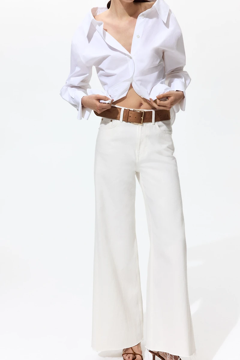5-pocket jeans in rigid cotton denim that feels firm at first, softening and relaxing with wear. Regular fit from waist to hip and wide cut from thigh to hem. High waist, belt in napped fabric, zip fly with button, and insets at sides. Wide, regular-length legs, designed to fall at top of foot with little or no stacking. Raw-edge hems.