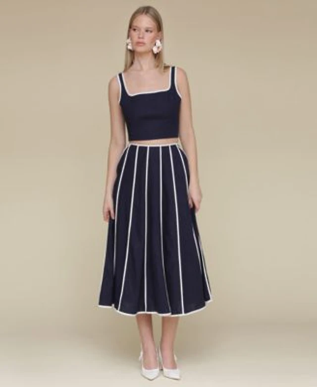 Avec Les Filles Womens Contrast Trim Linen Blend Crop Top Contrast Trim Linen Blend Midi Skirt