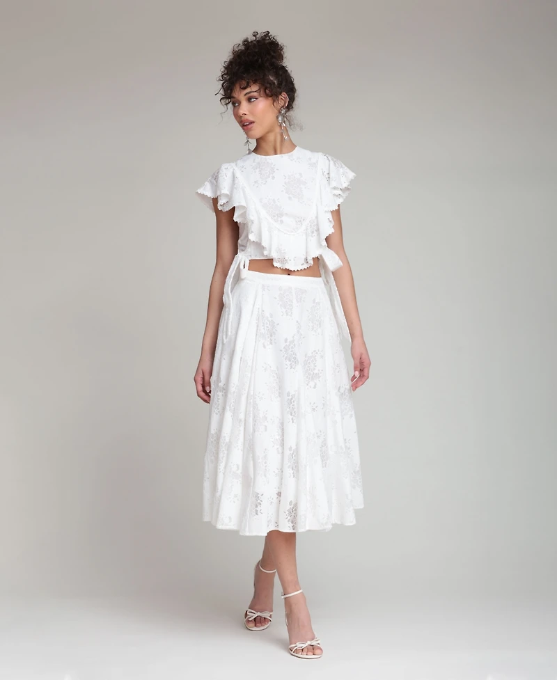 Light, airy elegance shapes this Avec Les Filles ruffle-trimmed top created for standout seasonal dressing. Tiered flutter accents enhance dimension across the bodice, and the side bow ties introduce a customizable fit and charm. Clean neckline construction maintains a refined structure, allowing the dramatic layers to take center stage.