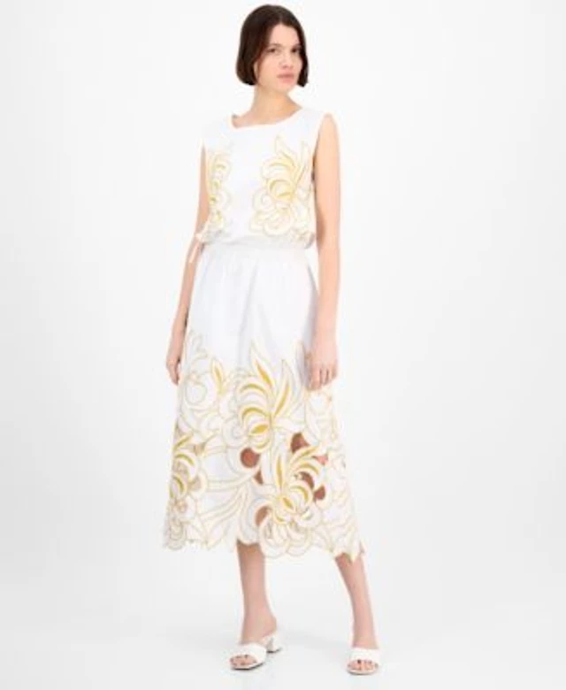 Avec Les Filles Womens Sleeveless Embroidered Drawstring Hem Top Embroidered Midi Skirt