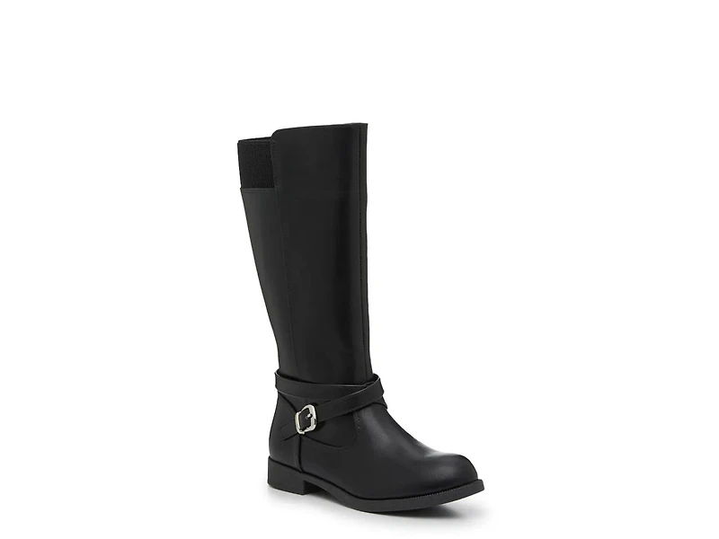 Add a timeless touch to your kiddo's collection with the Avery riding boots from Kelly & Katie. This classic style is a staple for the cooler seasons. Featuring a simple silhouette that is complete with crisscrossing straps on ankle.
