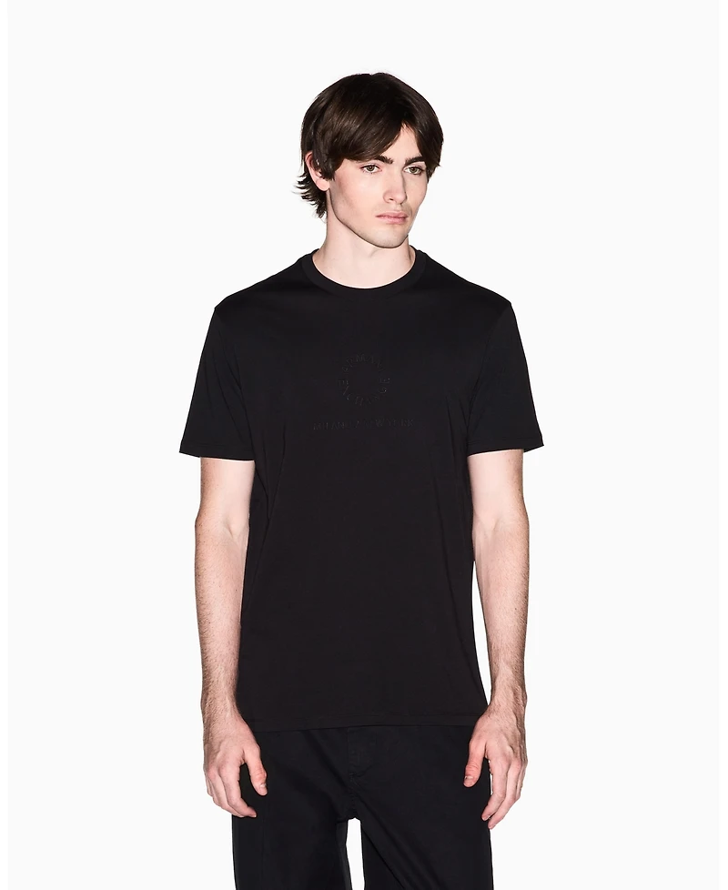This t-shirt features a bold circular ""Armani Exchange"" logo with ""Milano / New York"" text beneath in a raised tonal font. A sleek, modern design perfect for elevating your casual look