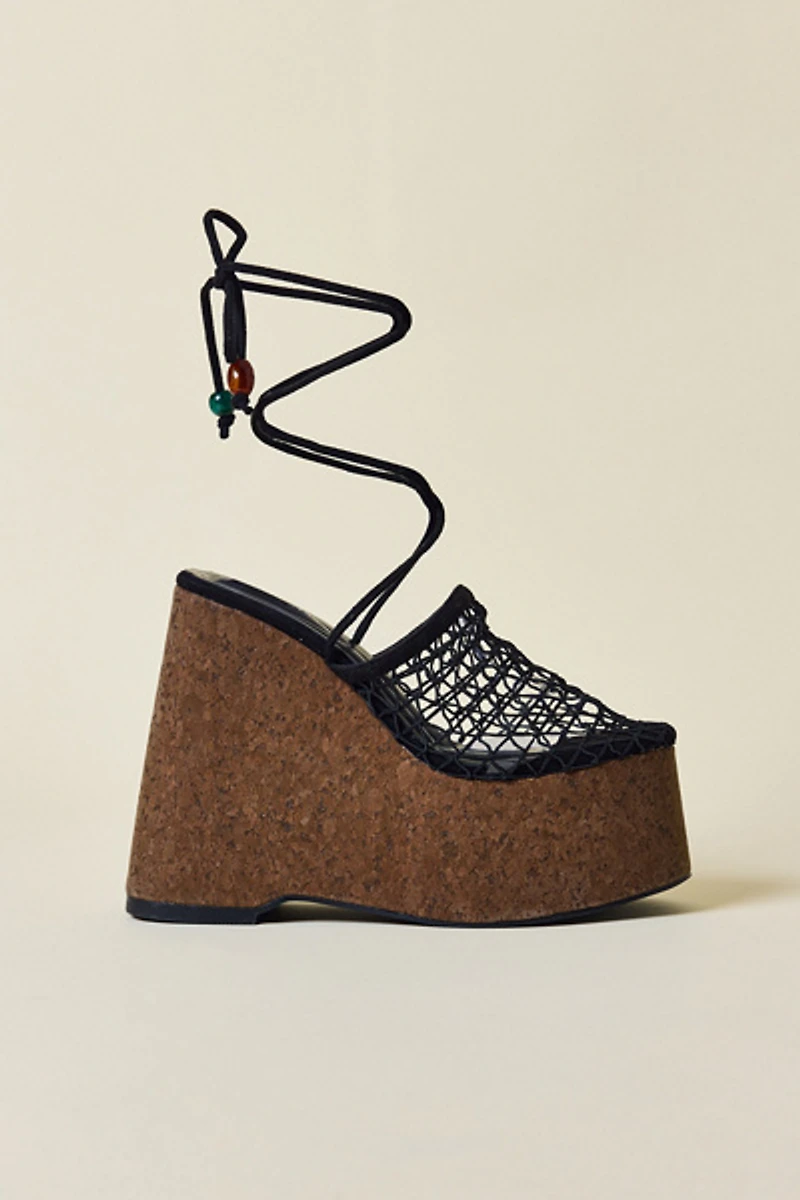 Azalea Wang shoes always make a statement. These Azalea Wang platforms have a sheer netted upper set on a towering platform sole in allover cork. Finished with a slinky strap that wraps around the ankle.