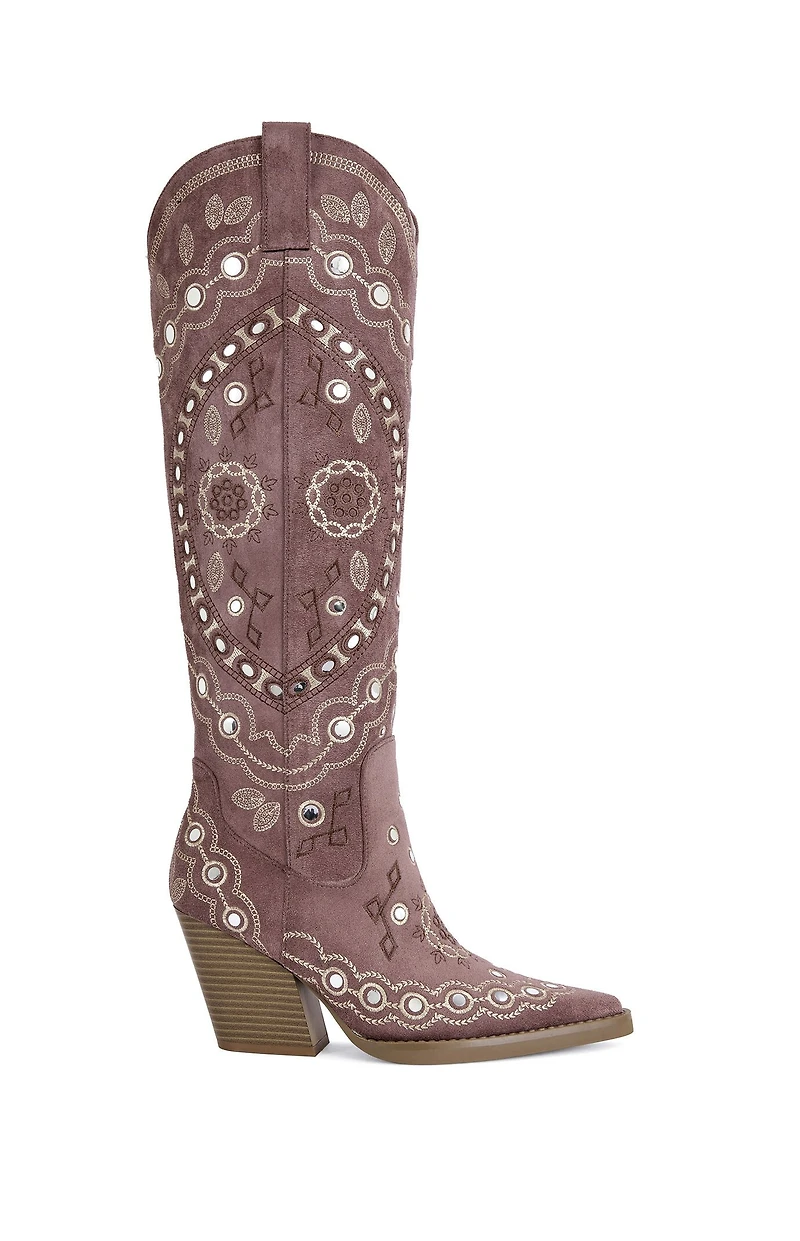 Your go-to Western Boot got reinvented. Denim western cowboy boot with intricate embroidery, sparkling embellishments, block heel, and pointed toe, is a statement-making blend of classic western and modern flair.